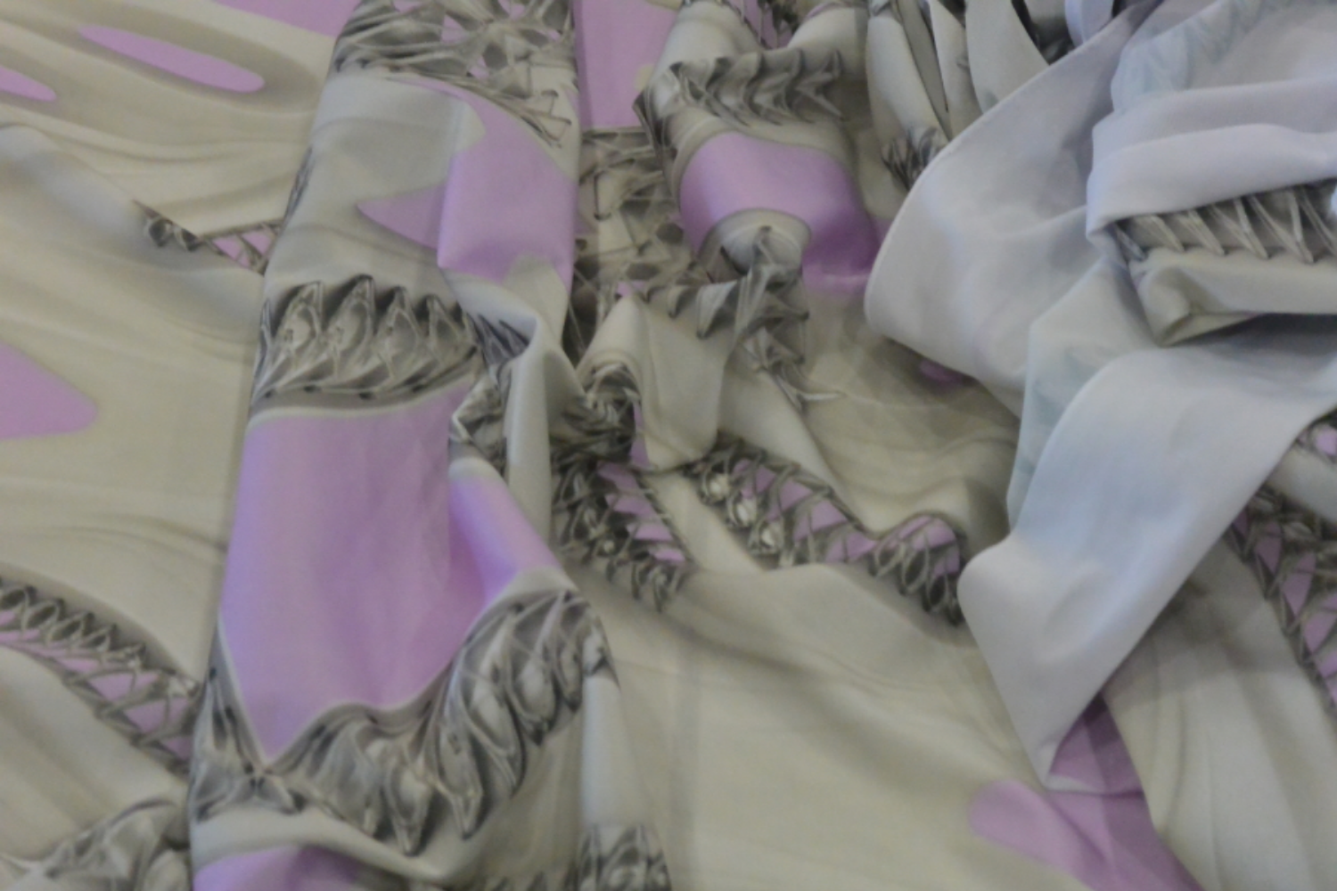 My inspiration for this collection is the work of my parents, Veronica & Eric Goldemberg. They are both architectural designers. I thought that the movement and structure of the pieces in two of their projects, was cool and interesting. So I decided to laser-print the forms in those projects as my fabrics.